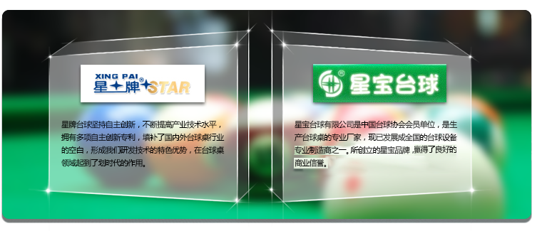 台球,绅士的运动;台 球桌,绅士的舞台。星 牌台球桌,一个倍受世 界台球大师赞誉的中国 产品;"星牌",享誉中 外的世界品牌。