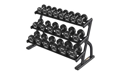 Axiom 系列短款和长款 3 层鞍形底座哑铃架拥有时尚迷人的外观,可方便地存放圆头哑铃。耐用的鞍形底座有助于哑铃的分隔和有序排放,而橡胶脚垫可以让哑铃架平稳站立,避免底板和支架受损。